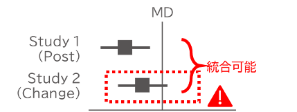 実際のレビューでは、介入後の値と変化量が混在して報告されていますが、MDを用いる限り両者を統合することに統計的な問題はありません。ただし、平均値や標準偏差の絶対値が異なるため、読者の混乱を避ける目的でサブグループとして区別することが望ましいことを覚えておいてください。
