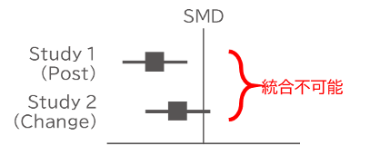 一方で、SMDを効果量とする場合は注意が必要です。SMDの標準化に用いられる標準偏差は、介入後スコアでは単一時点での個人間変動を反映するのに対し、変化量では個人内変動と個人間変動の両方を含むため、両者を直接統合することは推奨されていません。