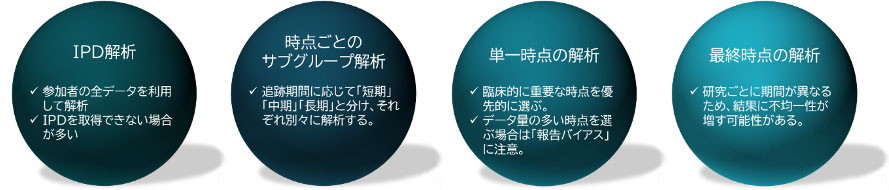 時間イベントのメタ分析には主に2つの方法があります。O–E統計量と分散を用いる方法とCox (コックス) 比例ハザードモデルから得られたlog (ログ) ハザード比と標準誤差を用いる方法です。両者が混在する場合も、ログランク推定値をlogハザード比に変換することで統合できます。