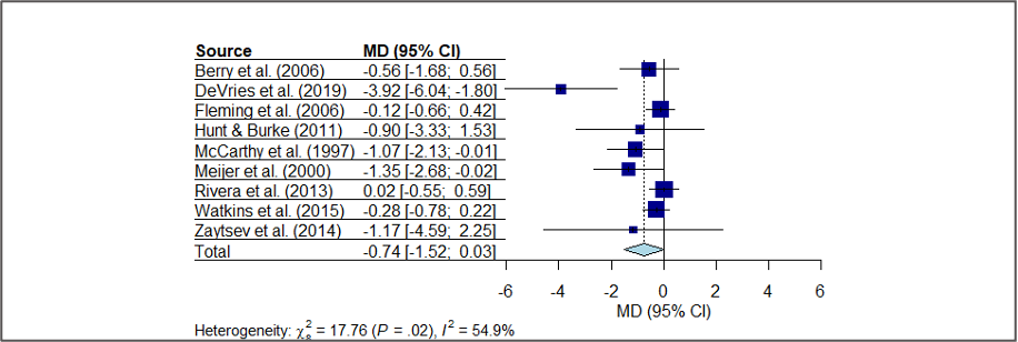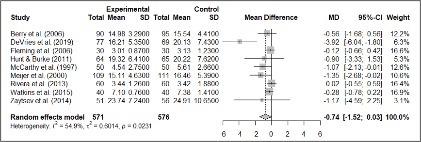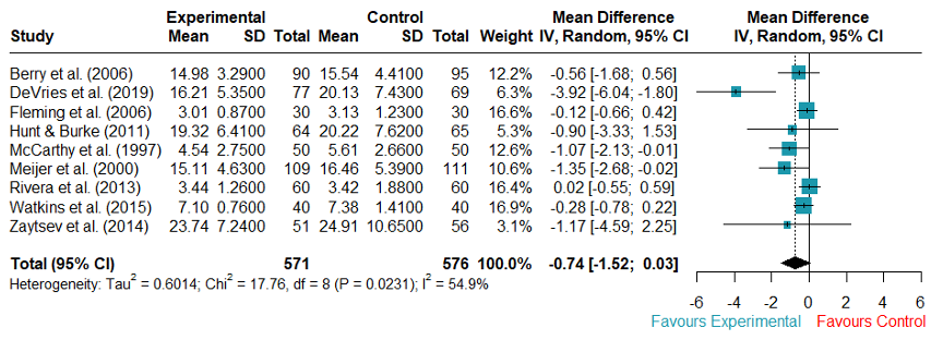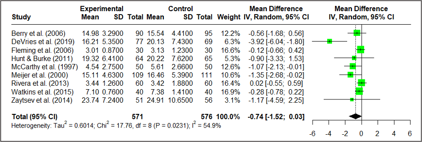 | Watkins et al. (2015) | 40 | 7.1 | 0.76 | 40 | 7.38 | 1.41 | -0.28 | 0.253 |