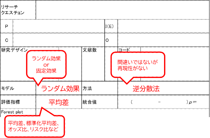 次の方法の項に問題があると考えています。ここで、逆分散法と記載している場合が多いですが、これだけの記載だと第三者が資料を見て再解析としてメタアナリシスをした場合に同じ結果を得られない場合があります。つまり、再現性がない状態です。この様式内もしくは本文中に、研究間分散の推定方法と信頼区間の推定方法を記載して、再現性のある結果であることを主張していきましょう。
