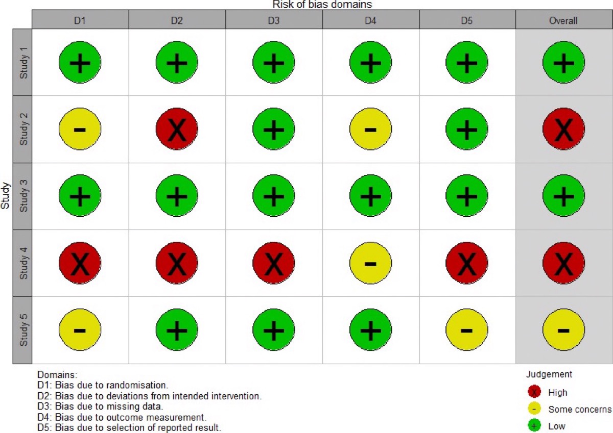 # ROB2のサンプルデータ(5研究 × 5ドメイン + Overall)