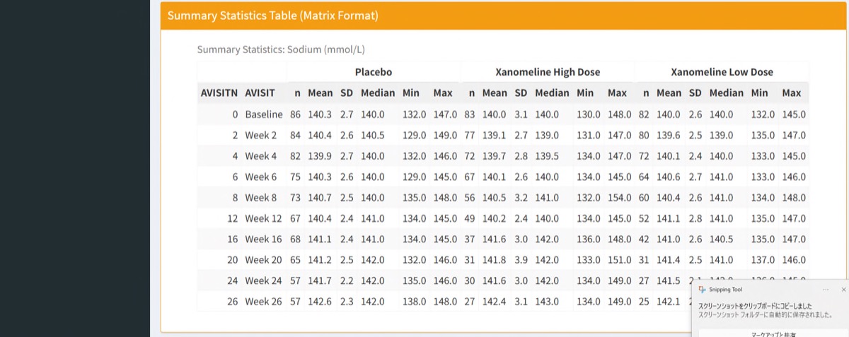 本稿では、tidyCDISCに含まれるADaM形式の臨床検査データ (ADLBC) を対象に、Shinyを用いて「平均推移」「分布」「要約統計」をワンクリックで確認できるダッシュボードを作成しました。