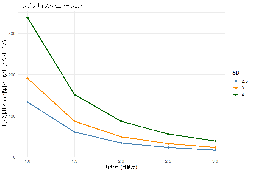 今回は、Rのpwrパッケージを用いて、標準偏差 (SD) と群間差の組み合わせが、例数にどのような影響を与えるかを整理します。